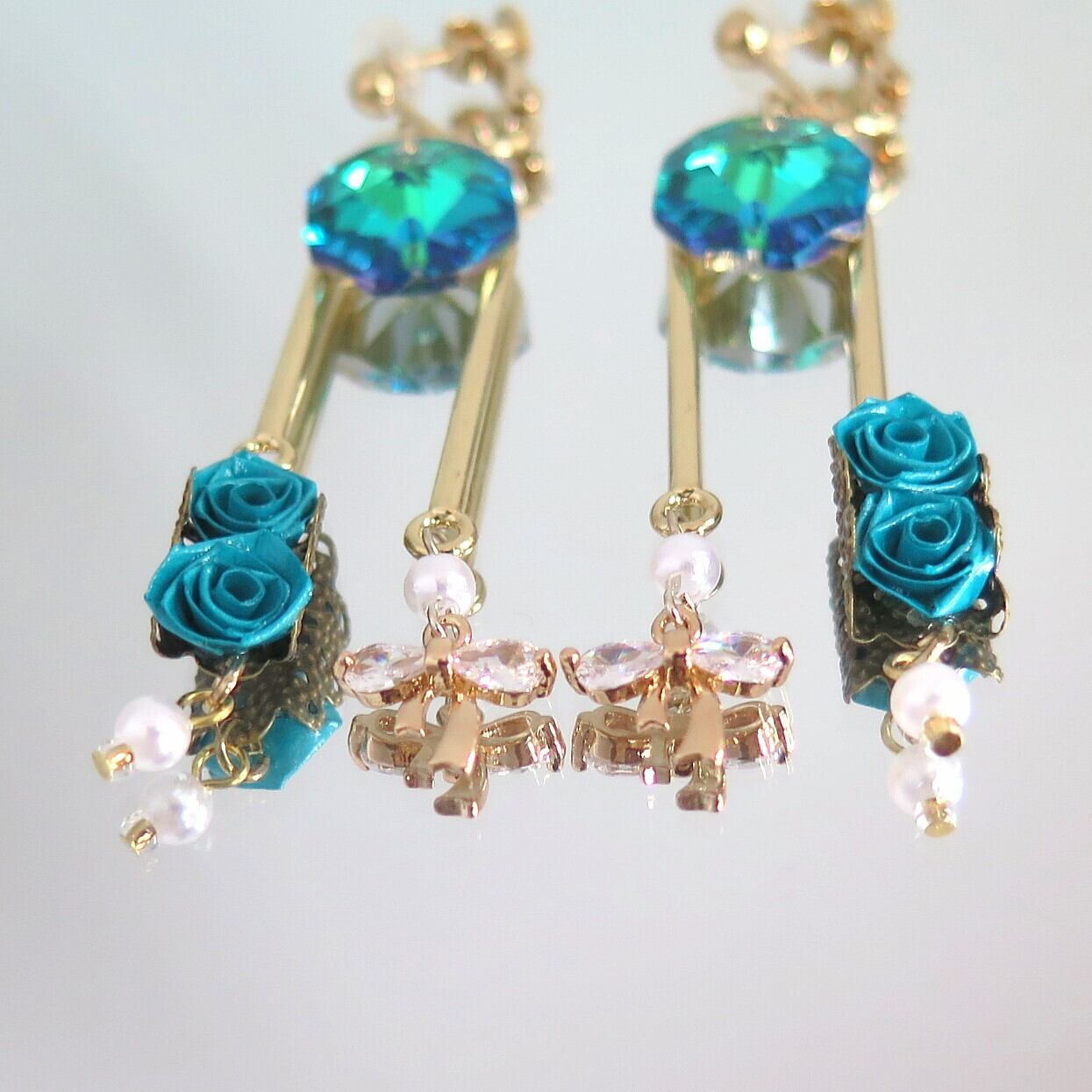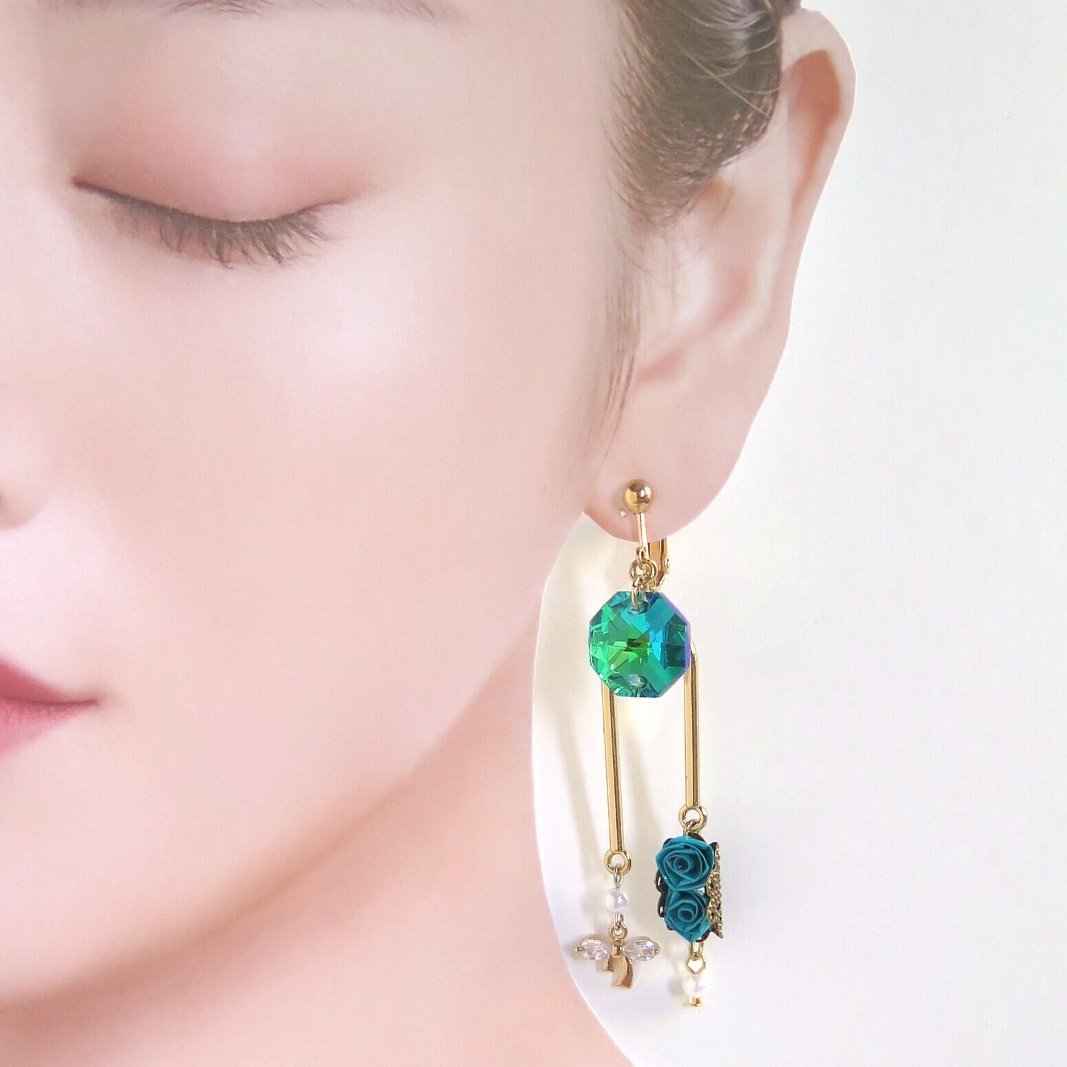 キラキラなビジューと艶やかな薔薇のダークロマンティックなピアス・イヤリング(グリーン)