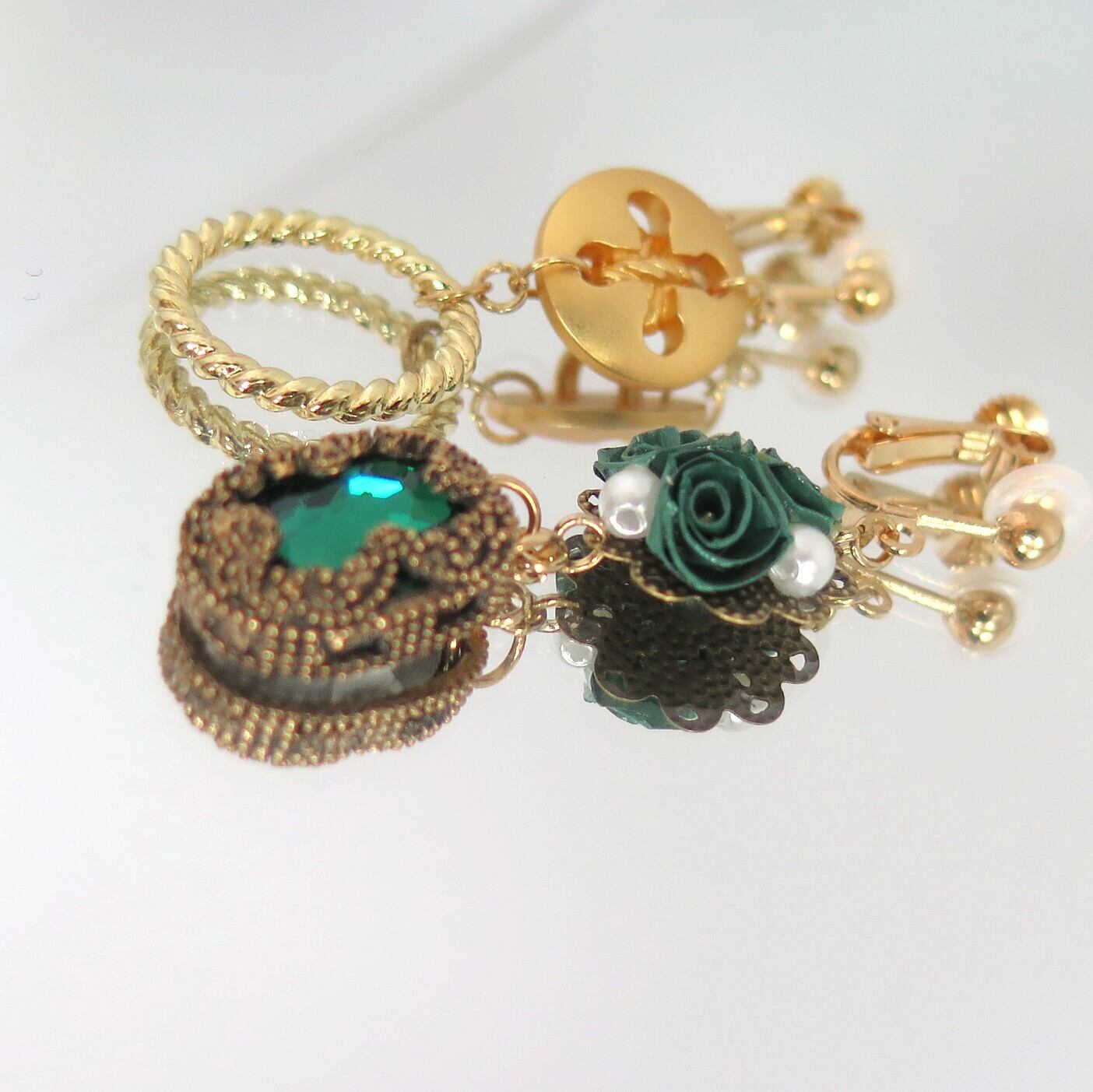一点もの!ディープグリーンボタンが美しいヴィンテージ調ピアス・イヤリング