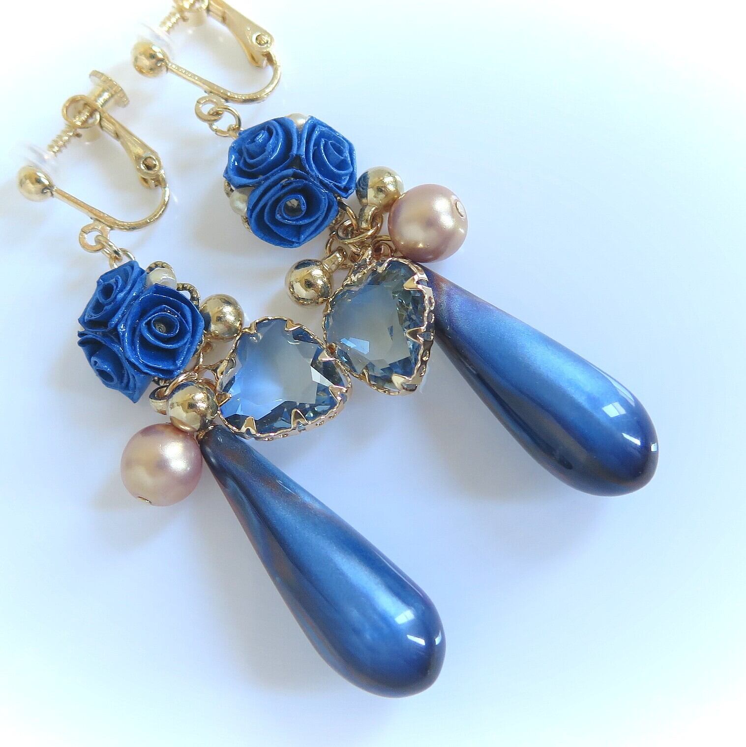 ロングドロップビーズとダーク薔薇のハートビジューピアス・イヤリング(ブルー)