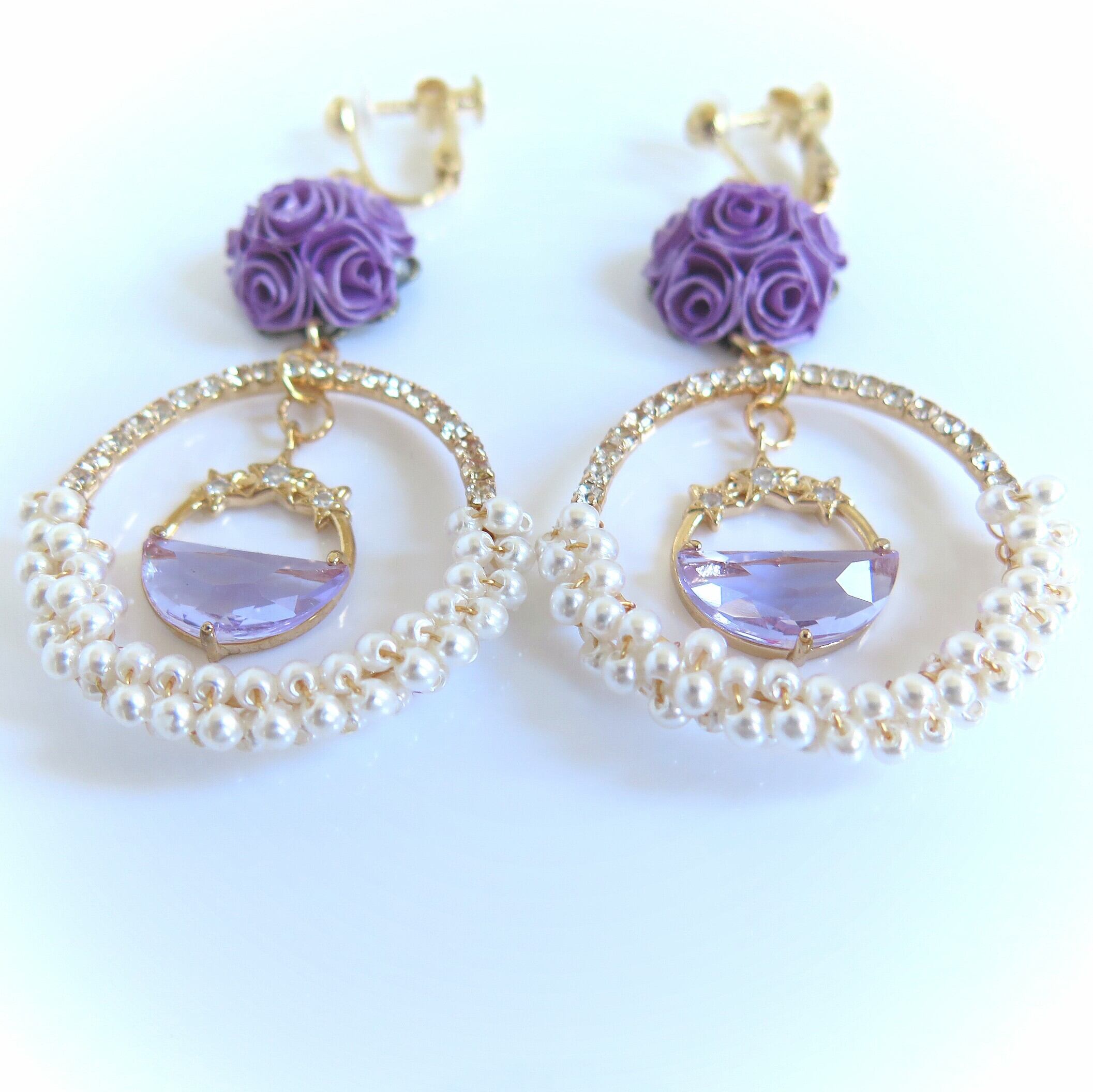 一点もの!ぷくぷくパールが可愛いガラスビジューと薔薇のフープピアス・イヤリング